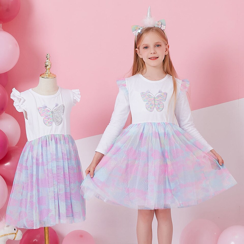 Autumn Girls Dress Butterfly Sequins Kids Long Sleeve Dresses Baby Girls Princess Dress Party Clothes Birthday Dresses