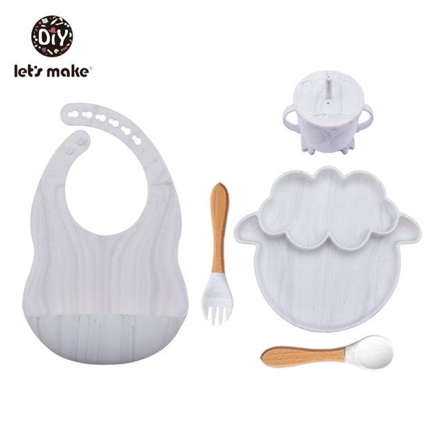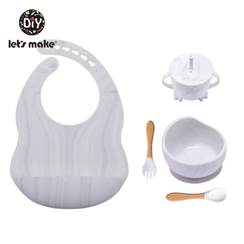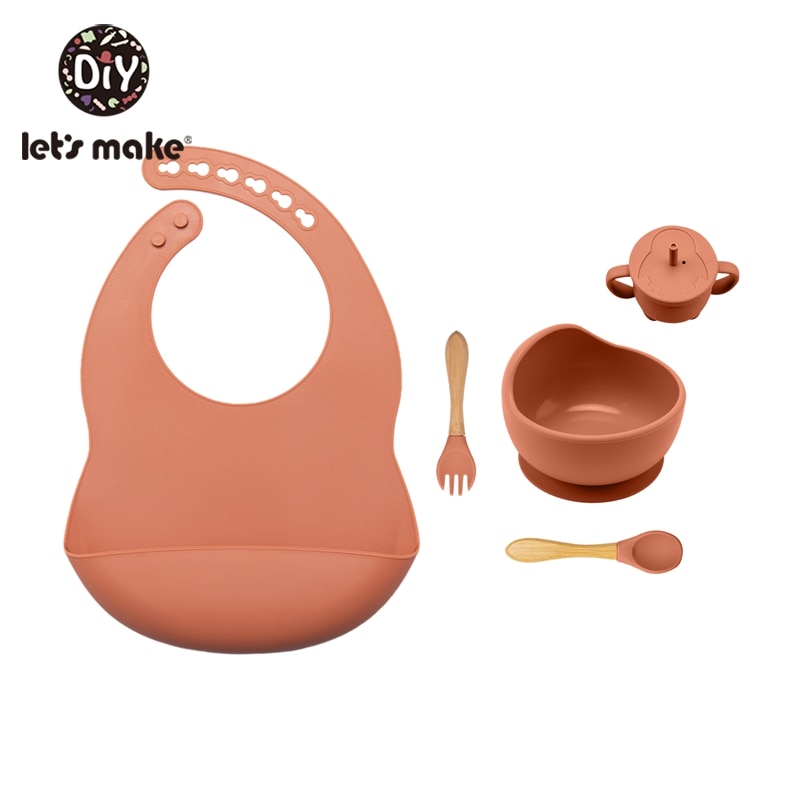 Let’S Make 5PCS/Set Baby Feedings Tableware Silicone Bowl Bib Cup Spoon Fork Non-Slip Bowl Suction Fixing Food Grade Baby Gift